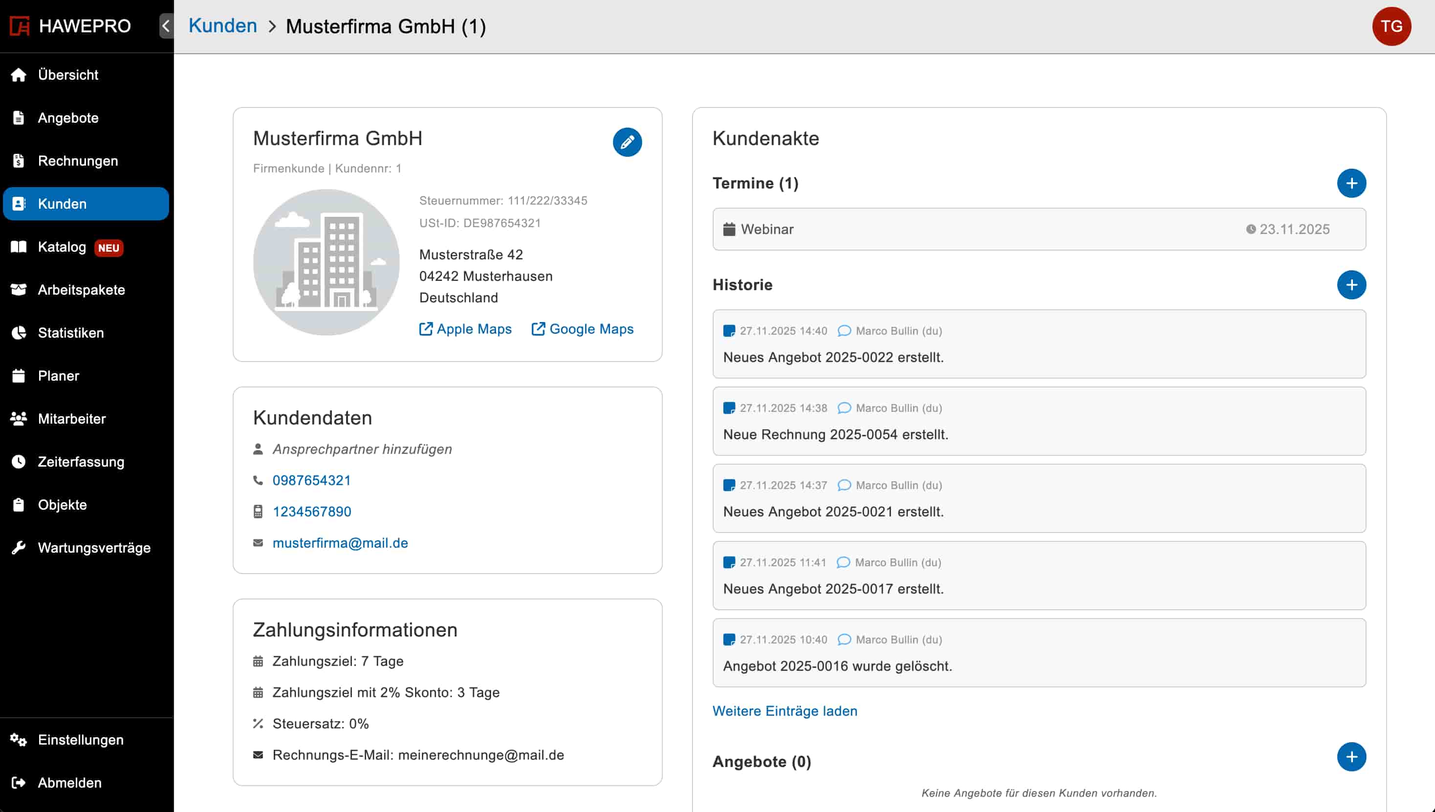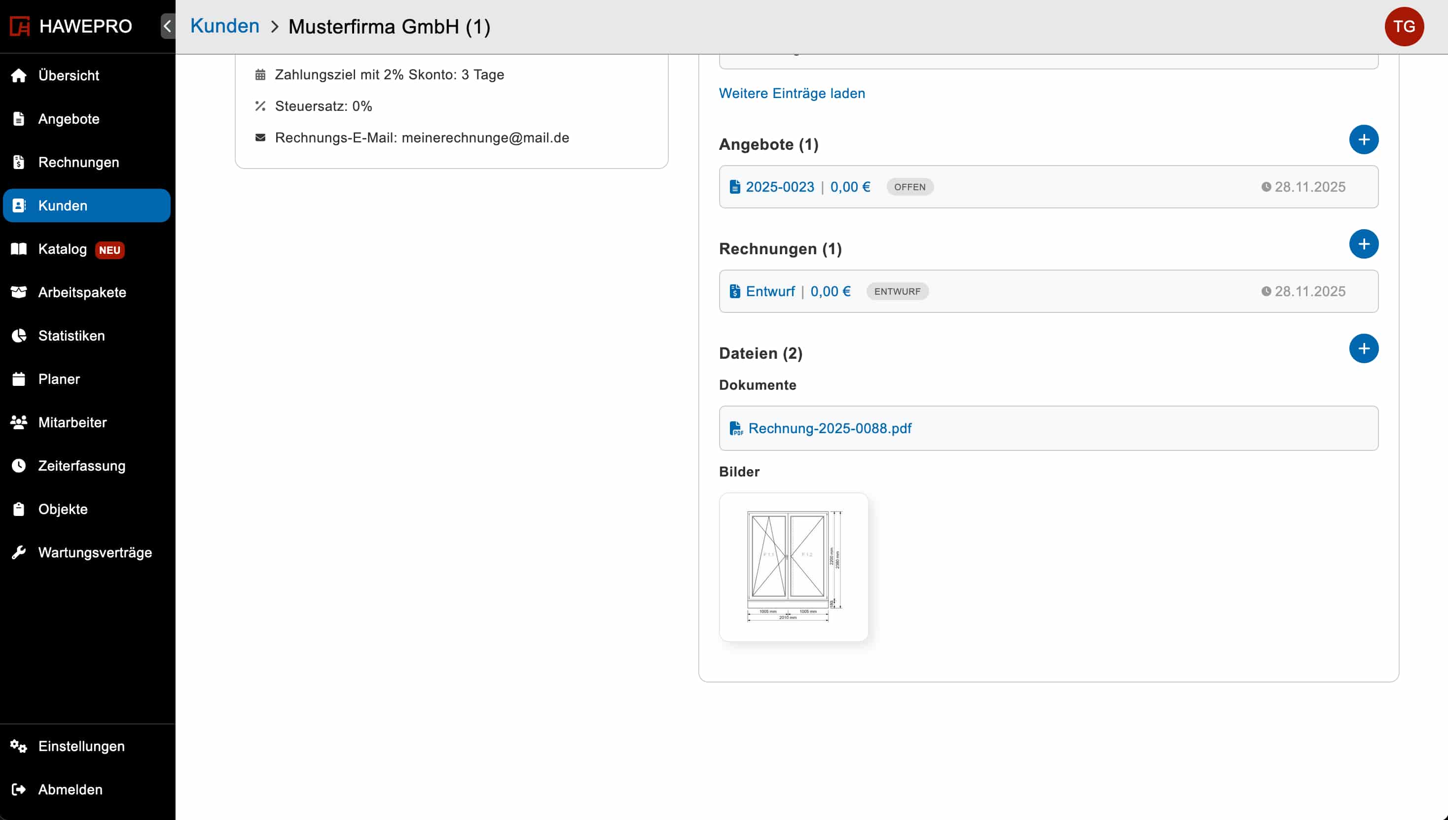 Sobald du einen Kunden anlegst, erstellt Hawepro automatisch eine Kundenakte.